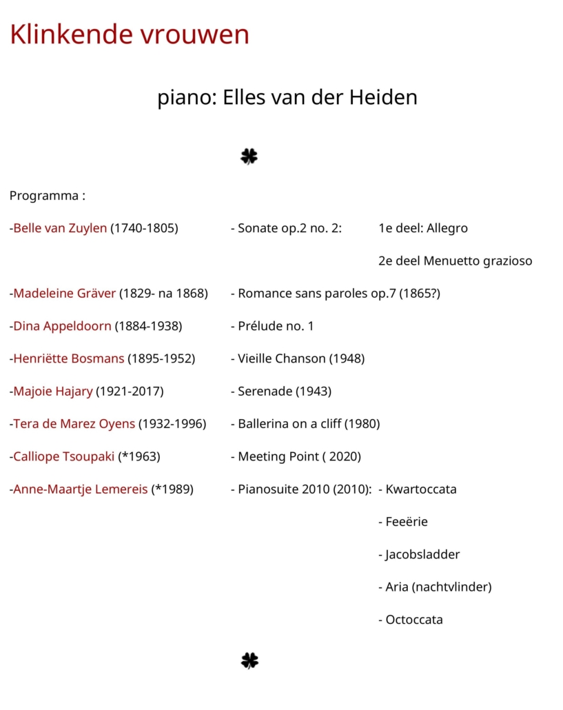 Klinkende vrouwen is een muziekvoorstelling over Nederlandse componistes die grotendeels nog ongehoord (en) onbekend bleven bij een groter publiek. Centraal staat een selectie van pianowerken van vrouwen die vanaf de tijd van de Verlichting tot nu werkzaam waren, en die pianiste Elles van der Heiden ten gehore zal brengen. Daarnaast zal zij de muziek toelichten met verhalen over deze markante vrouwen.